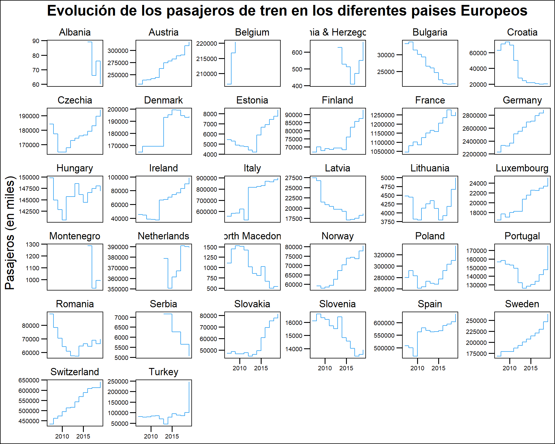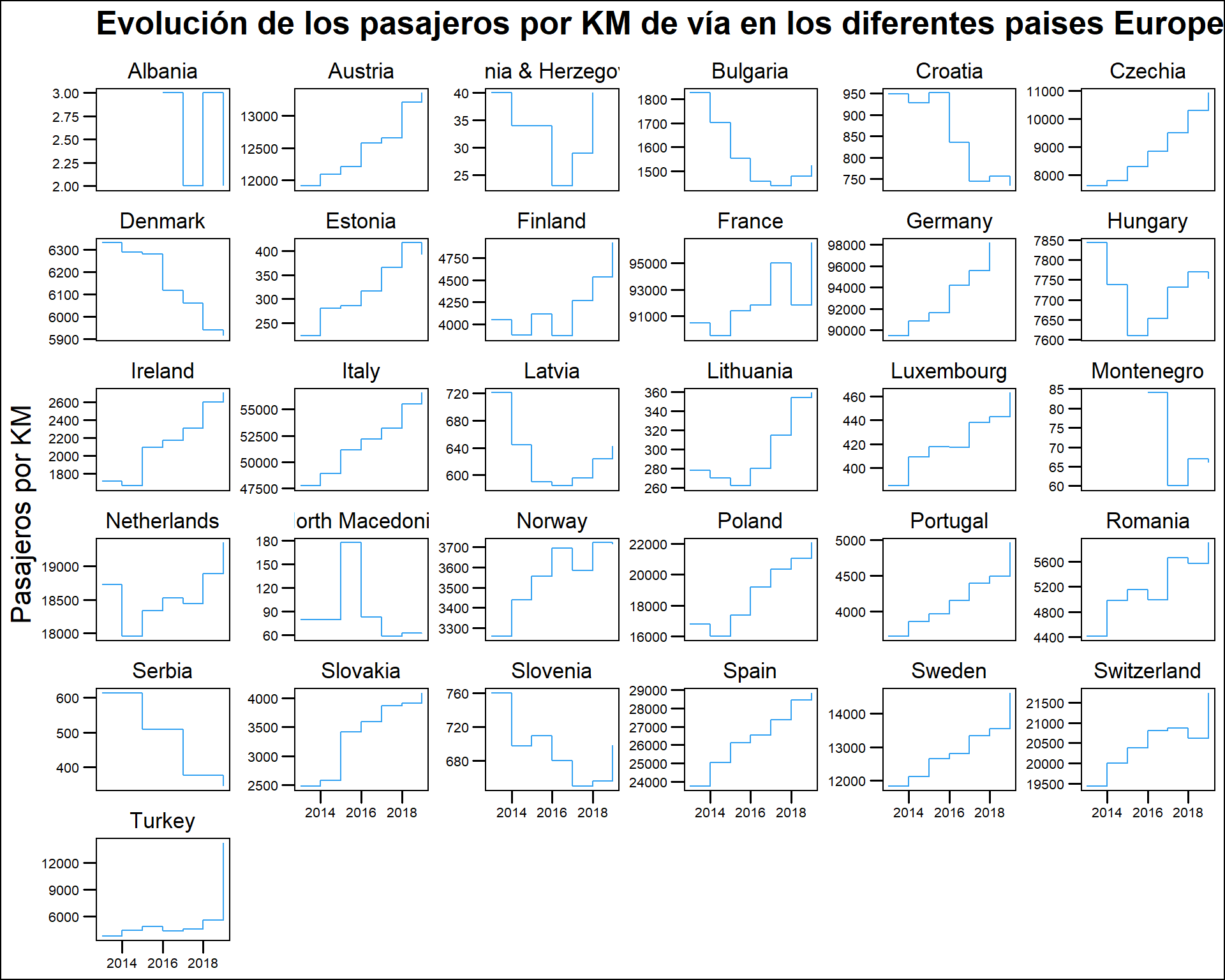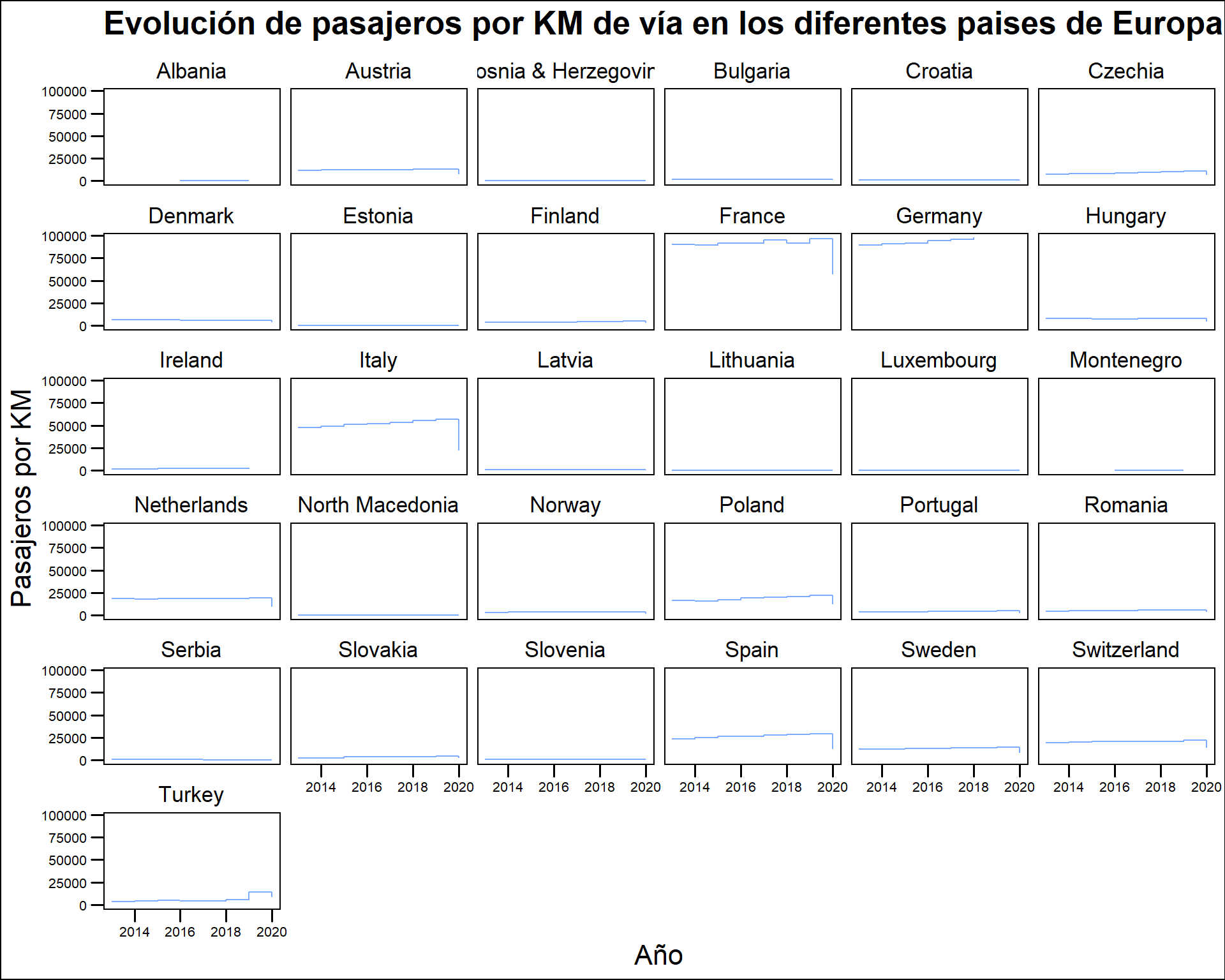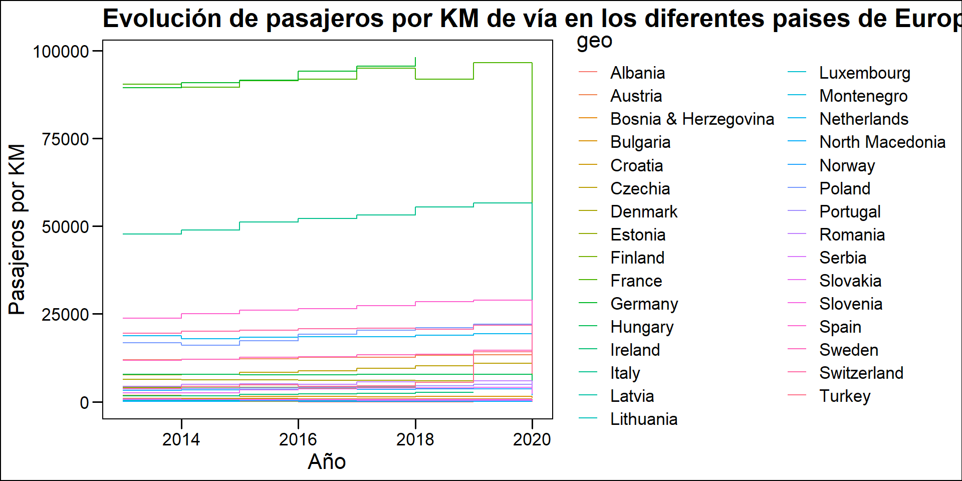Observamos el mismo problema de diversidad, podemos afrimar que algunos paises cada vez reportan menos pasajeros por kilómetro de via y a la inversa, como es el caso de España (ascendente) o el caso de Serbio o Dinamarca (descendente).
