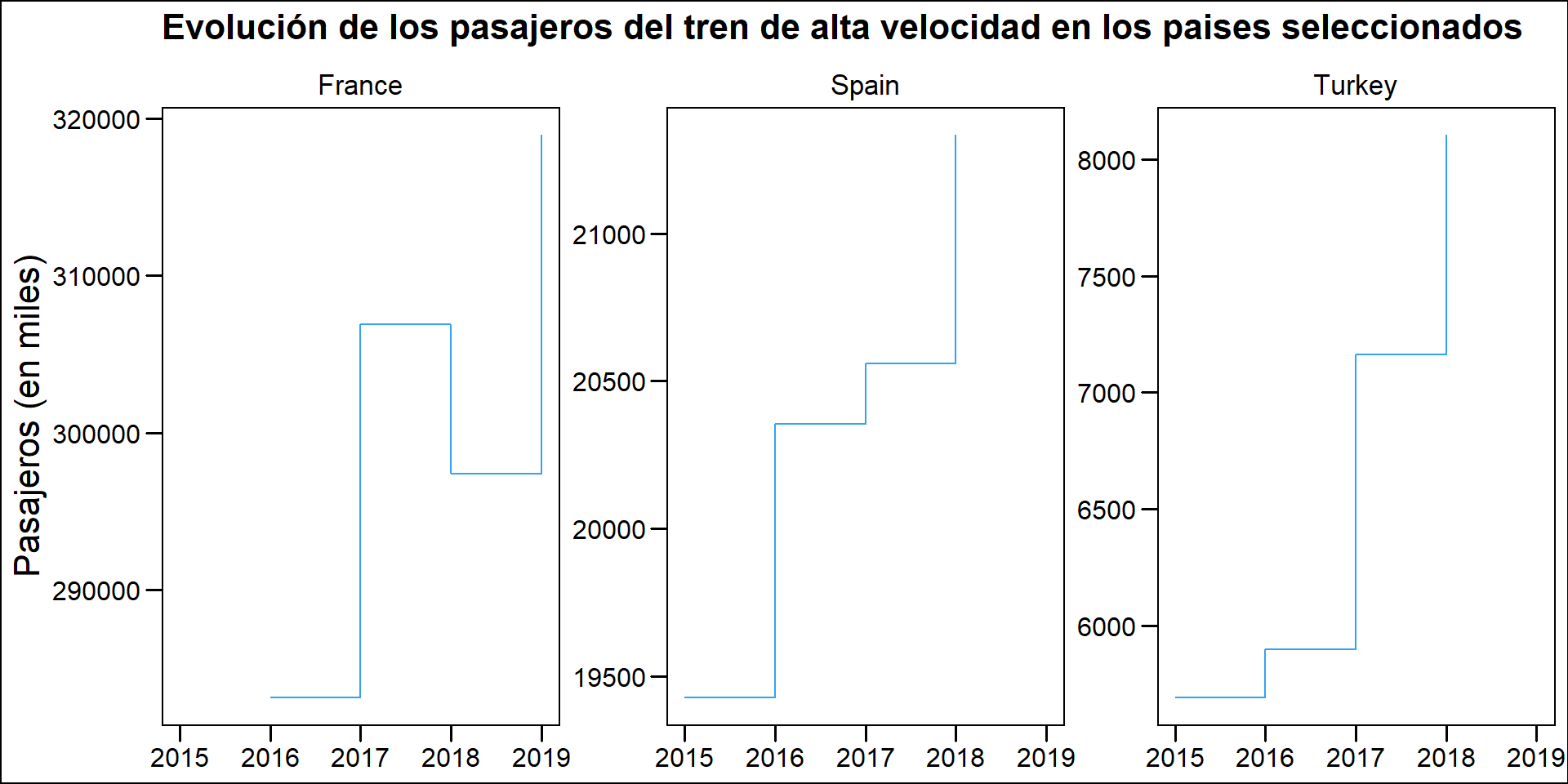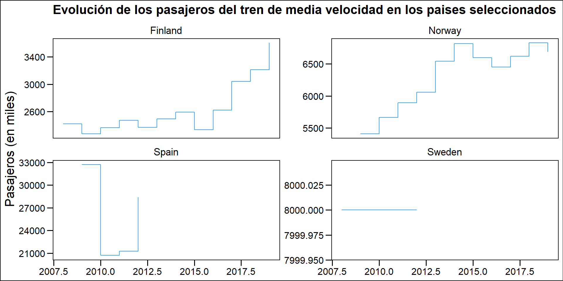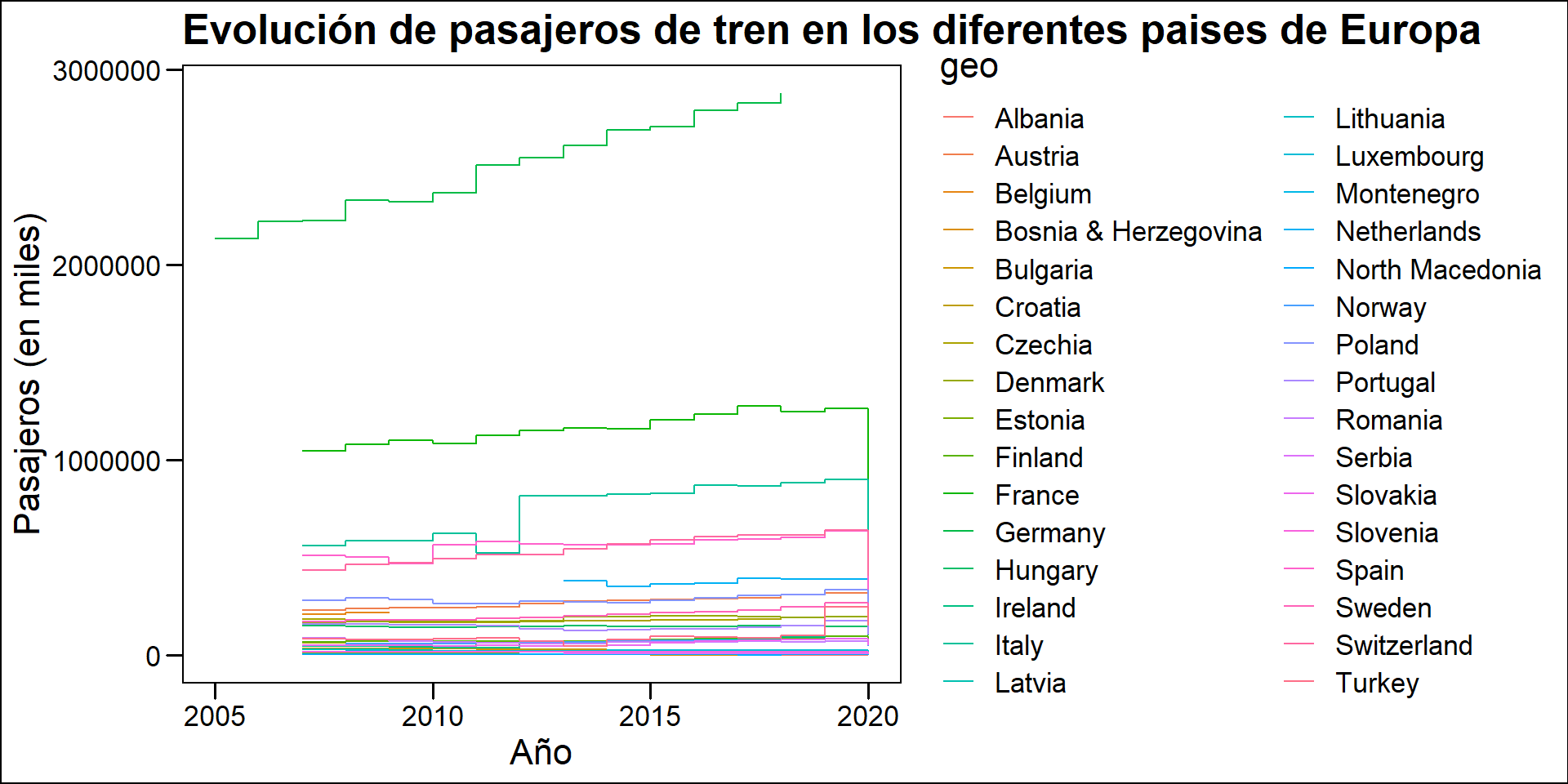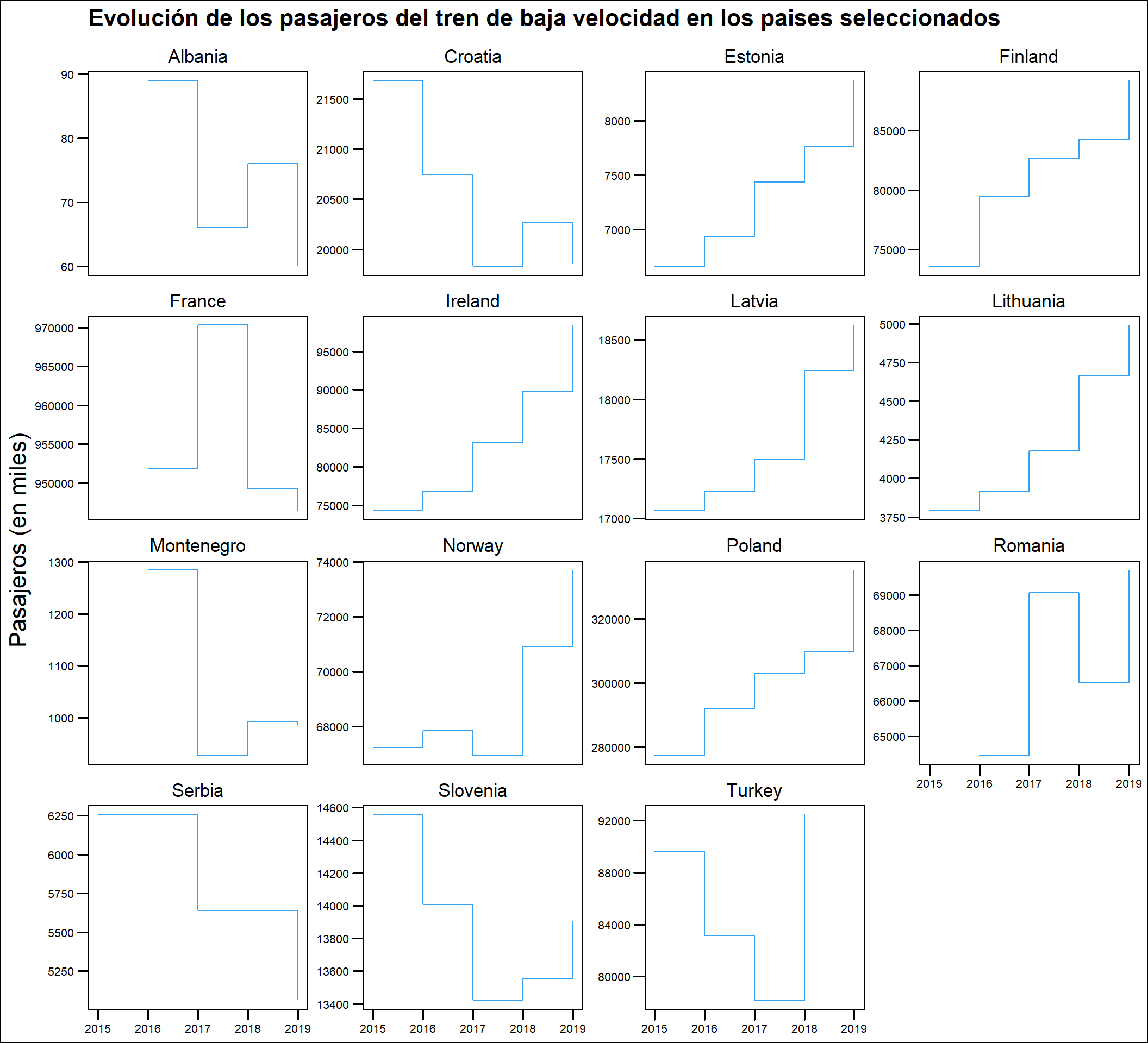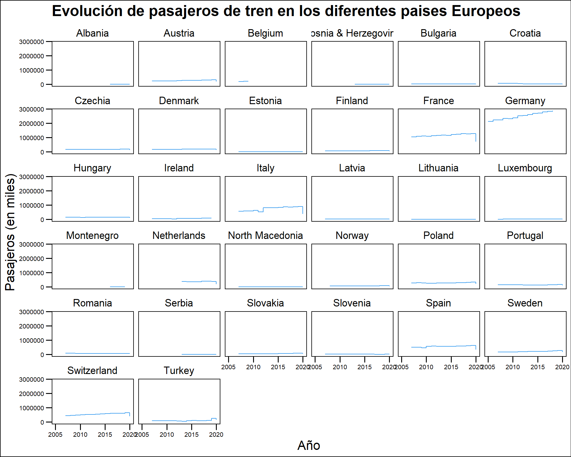 Observamos el mismo problema de diversidad, podemos afrimar que algunos paises cada vez reportan menos pasajeros por kilómetro de via y a la inversa, como es el caso de España (ascendente) o el caso de Serbio o Dinamarca (descendente).