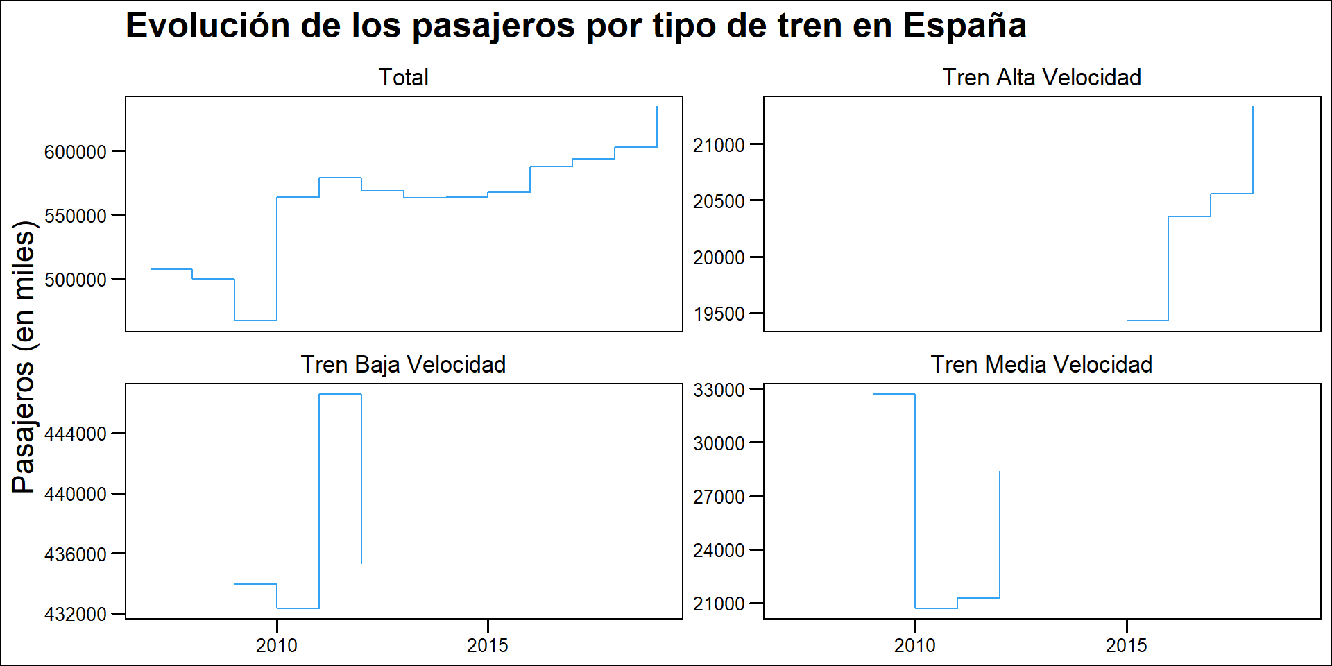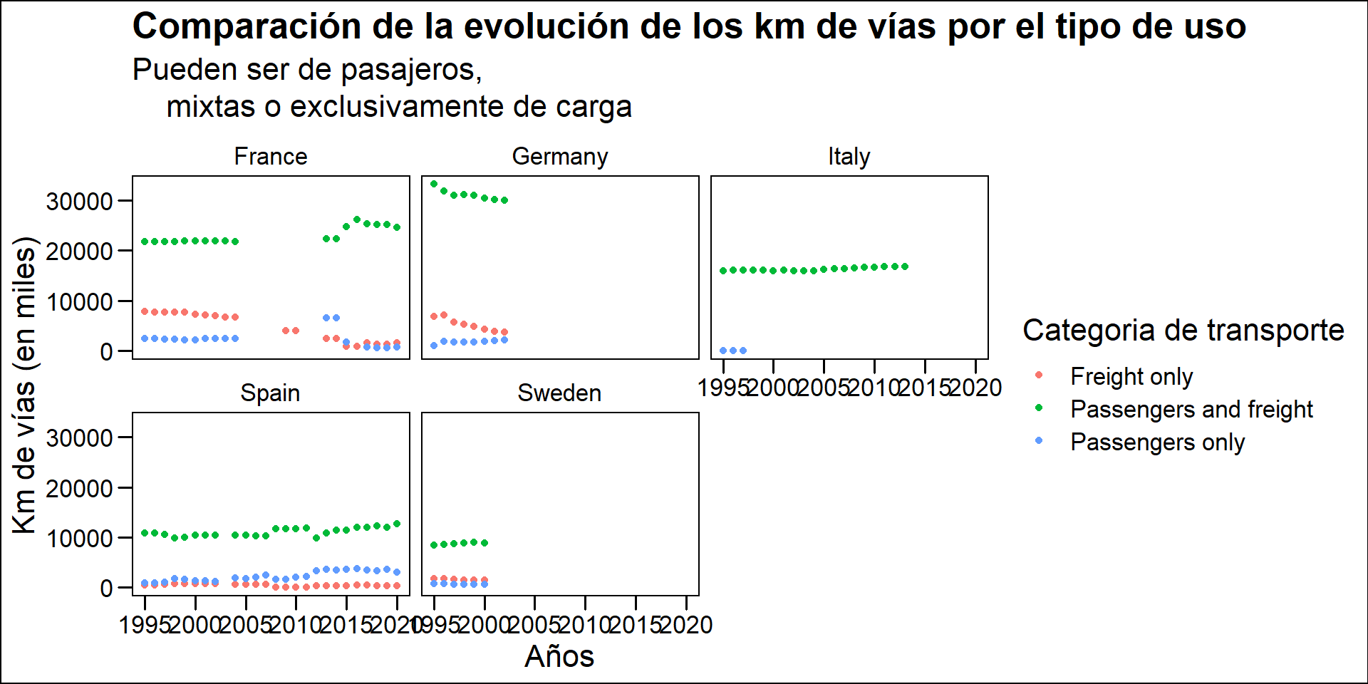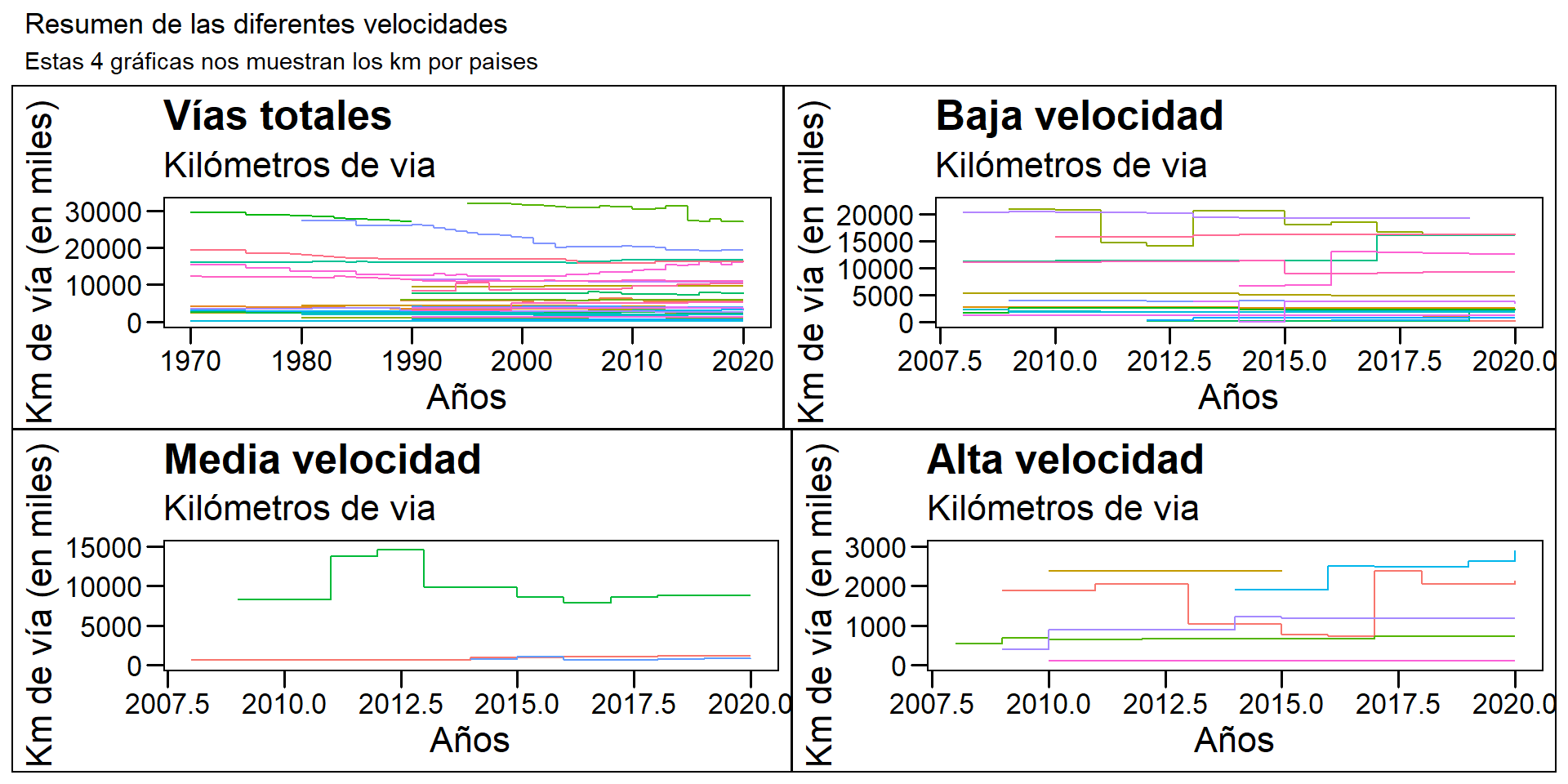 El primer gráfico que observamos es, de hecho, una agrupación de 4 gráficos diferentes, donde se puede observar la evolución histórica de los km de vía para cada país, tanto los totales como por categorías.