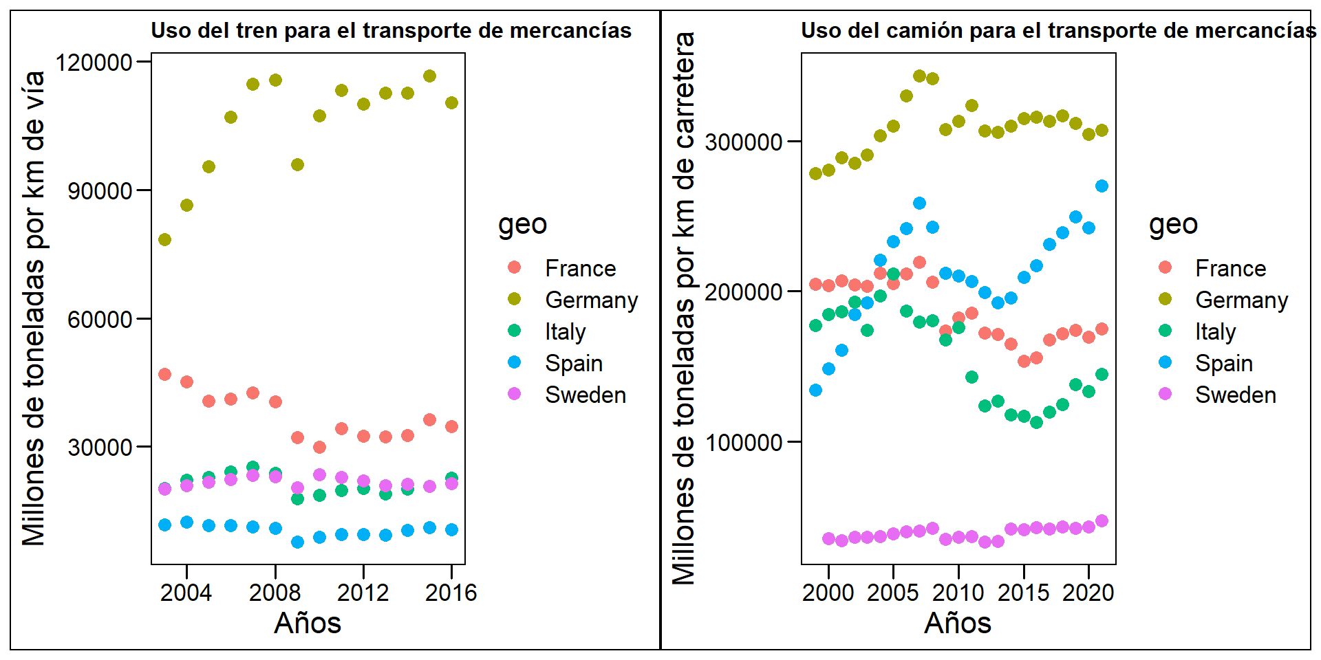Se observa que la mercancía transportada en España mediante el ferrocarril es más más baja que en Europa llegando a ser superado por Suecia. Esto viene determinado por la preferencia en españa por el transporte en camión, que es un medio de transporte más flexible y que permite el transporte “puerta a puerta”. Además este bajo uso del ferrocarril, también viene consicionado por el ancho de vía español (igual que el inglés) que difiere del del resto de Europa, lo que impide un tránsito fluido una vez se quiere cruzar la frontera.